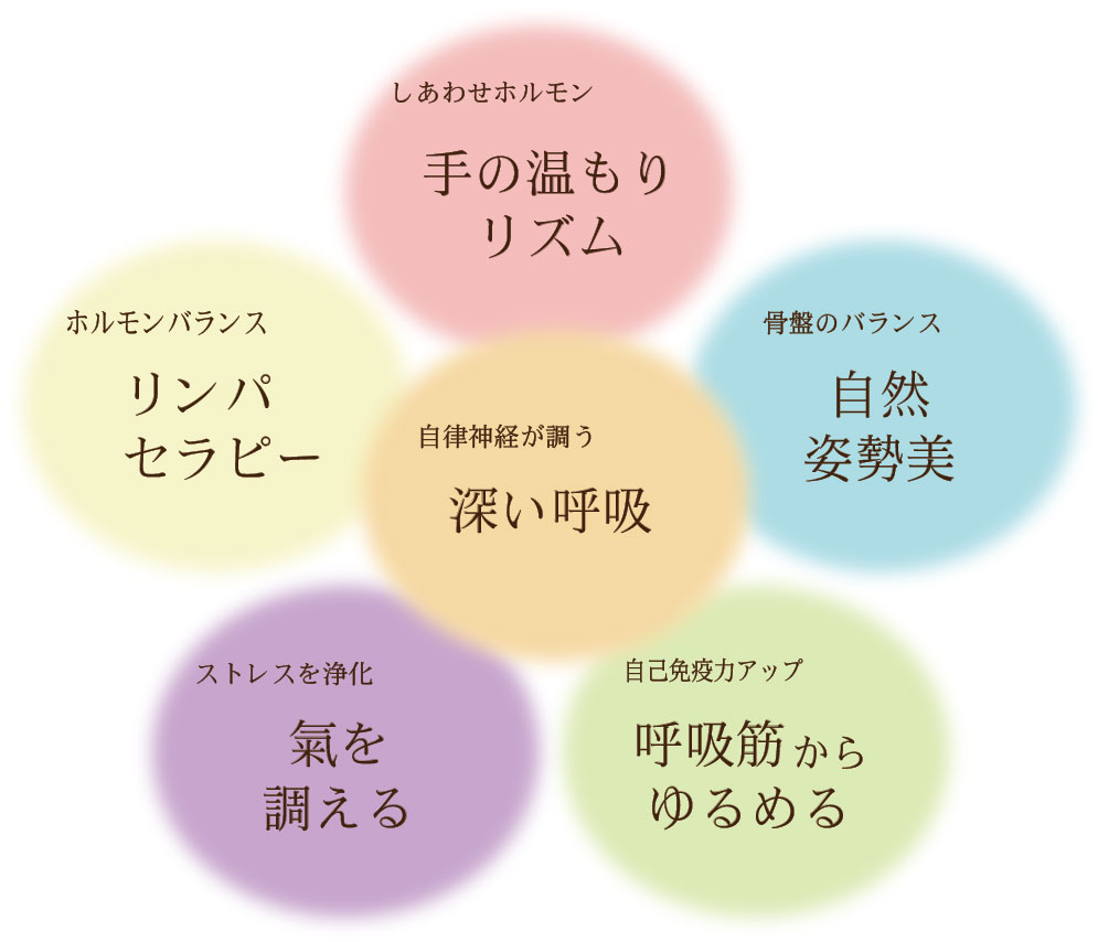 自律神経を効果的に活性化させ、内蔵、血流、代謝など、身体の機能が正しく働くことをサポート。女性の身体は、卵巣機能の低下などによっても呼吸が浅くなってしまう為、特に大切な呼吸です。